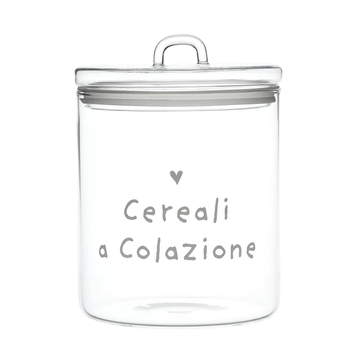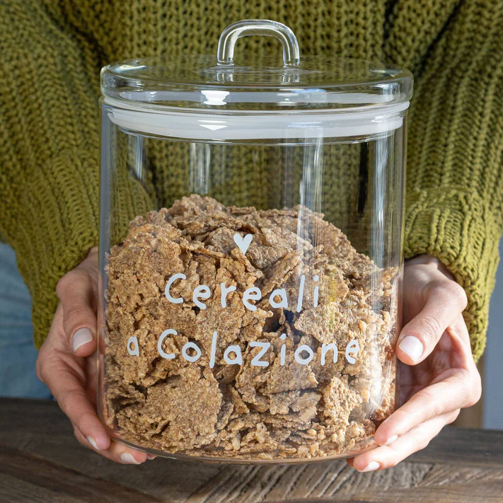 Barattolo porta cereali in vetro borosilicato con la scritta “Cereali a colazione” per conservare i vostri cereali preferiti.