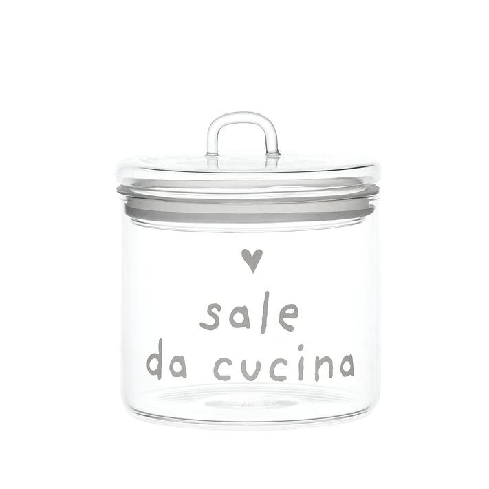Barattolo in vetro borosilicato decorato con la scritta “Sale da cucina” e un delicato cuoricino bianco.
