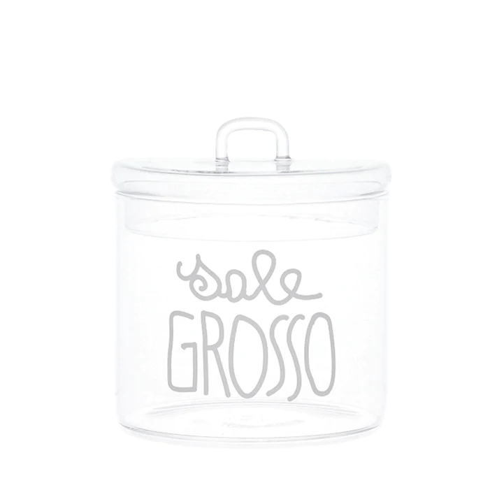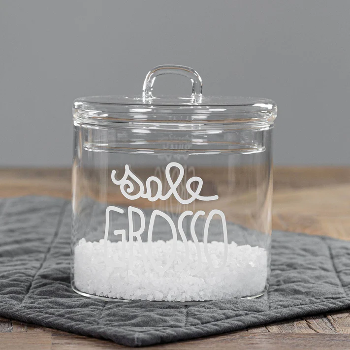 Barattolo in vetro borosilicato decorato con la scritta “Sale grosso” in corsivo bianco.