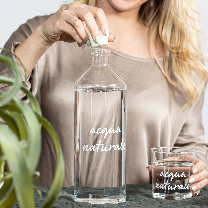 Bottiglia in vetro borosilicato con la scritta “Acqua naturale”, per portare in tavola la tua acqua preferita.